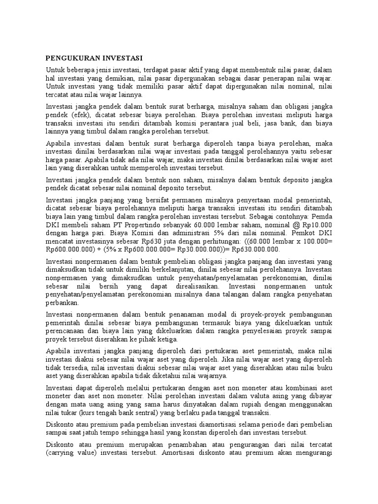 Mangsa simatupang, investasi saham dan reksa dana, (jakarta: Biaya perolehan dari properti investasi yang dibeli meliputi biaya pembelian dan setiap pengeluaran yang dapat diatribusikan secara langsung, seperti. Dengan adanya pengukuran investasi ti diharapkan bahwa investasi yang akan dilakukan sesuai dengan kebutuhan organisasi serta sejalan dengan visi dan misi instansi terkait.
