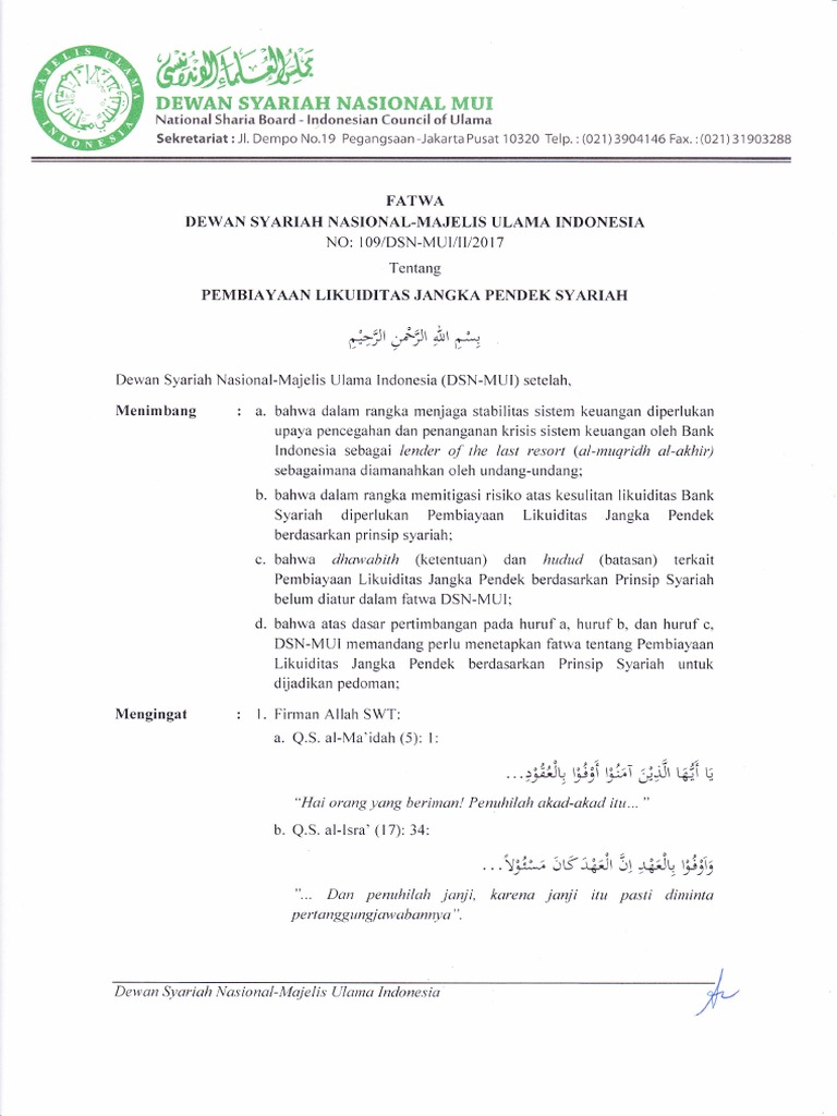 109 Pembiayaan Likuiditas Jangka Pendek Syariah (PLJPS)
